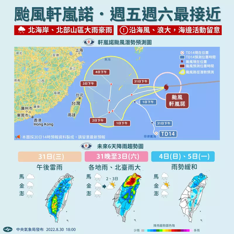 軒嵐諾類藤原效應互繞 往台灣接近中 |2022.08.31 語音朗讀 1062觀看次 字級 大 中 小 軒嵐諾颱風近中心的對流稍減弱,但雲系明顯擴大,昨天不明顯的外圍螺旋雲帶也發展起來。圖/取自氣象局網站 【本報台北訊】中央氣象局長鄭明典在臉書表示,第11號颱風軒嵐諾近颱風中心的對流稍減弱,但是雲系明顯擴大,30日不明顯的外圍螺旋雲帶也發展起來,表示颱風環流也同步擴大中。鄭明典說,颱風環流擴大就不利旁邊熱帶性低氣壓的發展,不過兩者位於同一個低壓環流內,所以還是會有類似藤原效應的互繞現象,颱風會先往台灣方向接近。軒嵐諾颱風31日動態圖。圖/天氣與氣候監測網氣象局說,強颱軒嵐諾31日2時的中心位置在琉球東方430公里海面上(台北東方1050公里海面上),以每小時24公里速度,向西南西進行。七級風暴風半徑220公里,十級風暴風半徑70公里。熱帶性低氣壓在琉球東南方海面,向北北東移動,時速10公里,有發展為輕度颱風的趨勢。今(31日)白天各地及馬祖大多為多雲到晴,澎湖、金門有局部短暫陣雨,午後西半部地區及東半部山區有局部短暫雷陣雨,雲林以南山區並有較大雨勢發生的機率,晚間南部地區亦有局部短暫陣雨或雷雨。今晚起至明天颱風外圍環流影響,北部及東北部地區有陣雨,澎湖、金門及馬祖有局部短暫陣雨,基隆北海岸及北部山區並有局部大雨或豪雨發生的機率,其他地區為多雲到晴,午後有局部短暫雷陣雨。今天清晨馬祖地區易有低雲或局部霧影響能見度;明天台南以北、基隆北海岸、東部、東北部沿海空曠地區及馬祖、澎湖將有8至9級強陣風;基隆北海岸、東半部(含蘭嶼、綠島)及恆春半島沿海有長浪發生的機率。強颱軒嵐諾周五、周六最接近。圖/取自氣象局網站 前一篇文章 新聞千里眼 下一篇文章 中職/悍將樂天發動交易 二換二預計9月生效 熱門新聞 01HBL周末總決賽 8校燃戰火 2026.03.2002返鄉火車擠爆2026.03.2003中南部大旱 高雄3月已73件山林火警 2026.03.2104珍寶入地宮 法華經奉納佛光大佛2026.03.2105星雲大師全集【傳記】 百年佛緣─社緣篇 我辦大學等社會教育3-32026.03.2006星雲大師靈骨 12道場迎奉法燈遠傳2026.03.2007動物還會報恩2026.03.2008【青│春│部│落】清晨的校園時光2026.03.2009人間佛教聯合總會訪越南 弘法新契機2026.03.2310非洲人象共享生存空間 蜜蜂化解衝突2026.03.21 訂閱電子報 台北市 天氣預報 台灣一週天氣預報 相關報導 台東實彈操演 美技術人員在場非核轉彎 卓:反核非神主牌李貞秀與2白委聯合質詢 邱垂正間接備詢汽油漲1.8元 卓揆:政府吸收13.2元盧秀燕出訪 藍:有助化解疑美論總統登海鯤號 防長:不設定交艦時程