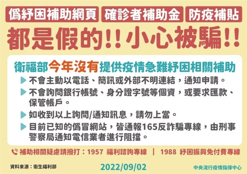 【本報台北訊】詐騙猖獗,近期不少民眾收到「偽紓困補助網頁」、「確診者補助金」、「防疫補貼」等簡訊,中央流行疫情指揮中心今(2日)再次宣導,衛福部目前都沒有因應疫情,提供急難紓困相關補助,「上述簡訊都是假的,小心被騙」。