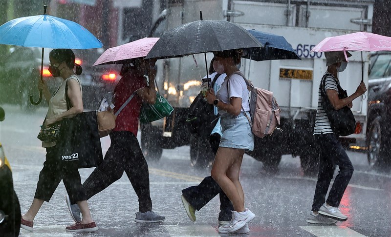 受颱風外圍環流影響,北市2日不時落下大雨,民眾撐傘通過濕漉漉的行人穿越道。圖/侯永全