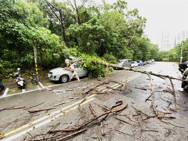新北市消防局3日表示,受颱風軒嵐諾逼近影響,淡水區紅樹林路附近上午發生路樹傾倒事件,砸中路旁停放汽車,所幸無人受傷,消防局獲報後隨即派員前往處理。圖/北市消防局提供