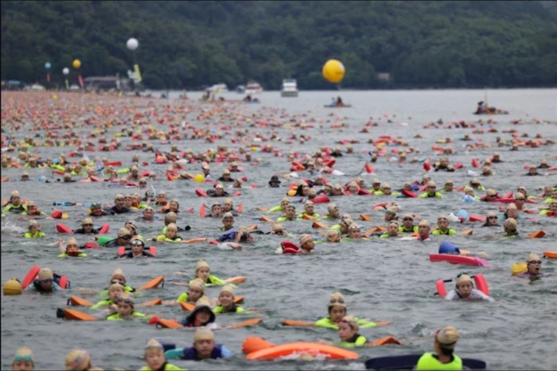 日月潭萬人泳渡受軒嵐諾颱風攪局,活動中雨勢不斷,是泳渡辦理至今40年來第一次遇到下雨。 圖/南投縣政府提供