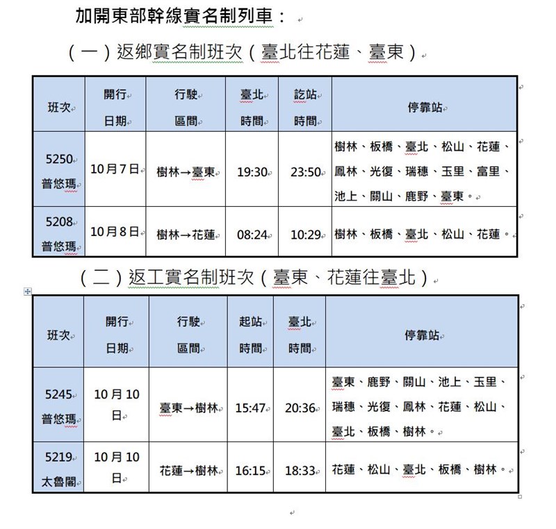 111年國慶連假加開東部實名制列車。圖/台鐵提供