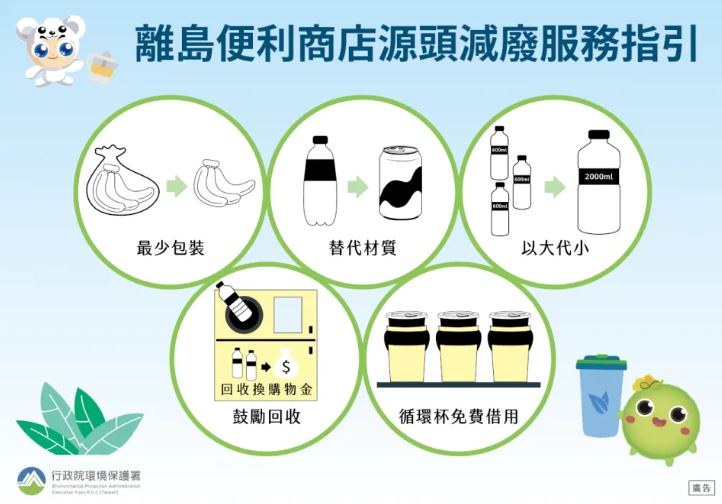 行政院環境保護署今天發布新聞稿表示,與離島便利商店訂定「離島便利商店源頭減廢服務設計指引」陸續和統一超商(7-11)及全家便利商店協議推動,重新思考設定離島門市陳列販售商品的種類、容器材質及包裝等,朝向最少包裝、替代材質、以大代小,三大主軸減少塑膠用量。