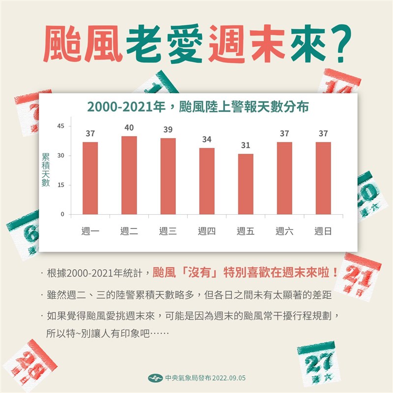 氣象局小編透過科學數據,統計近22年(2000至2021年)有「發布颱風陸上警報」的日子,在一周內的分布,根據統計結果,顯示颱風並沒有愛挑周末來,周末被颱風干擾的天數,並沒有特別多。圖/取自中央氣象局臉書粉專「報天氣 - 中央氣象局」