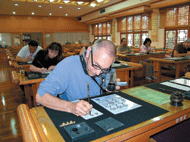 佛光山在他們的參觀行程中,是最具宗教代表性的景點,雖然他們並不了解佛教,但對於大雄寶殿、大佛城都表現出高度興趣,而他們此行特別要求到抄經堂抄經,體會中國的書法藝術,其中加州聖荷西水星報(San Jose Mercury News)的Rich Carlson右手拿著毛筆,左手拿著V8,為自己拍下寫毛筆的畫面,他說:「這是很珍貴的台灣之行紀念。」(人間社記者王麗君攝)