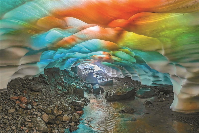 【本報綜合外電報導】大自然攝影師尼科斯(Mathew Nichols)日前在美國華盛頓州雷尼爾山國家公園(Mount Rainier National Park)附近的冰穴中徒步旅行,拍攝到太陽剛剛好照射到冰洞,冰層透出的陽光呈現七彩顏色,形成絢麗的「彩虹冰穴」絕美景象。
