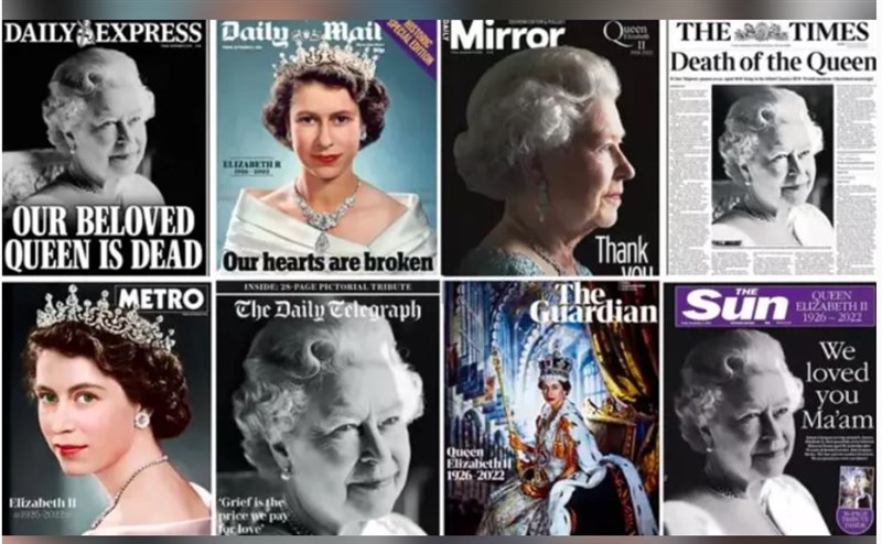 《太陽報》將其通常為紅色的報頭換成代表王室的紫色,標題寫著「我們愛你,夫人」,內文指她的辭世象徵「她歷史性在位的終結」,令人痛惜不已,並詢問女王葬禮那天是否可以宣布為銀行假日。
