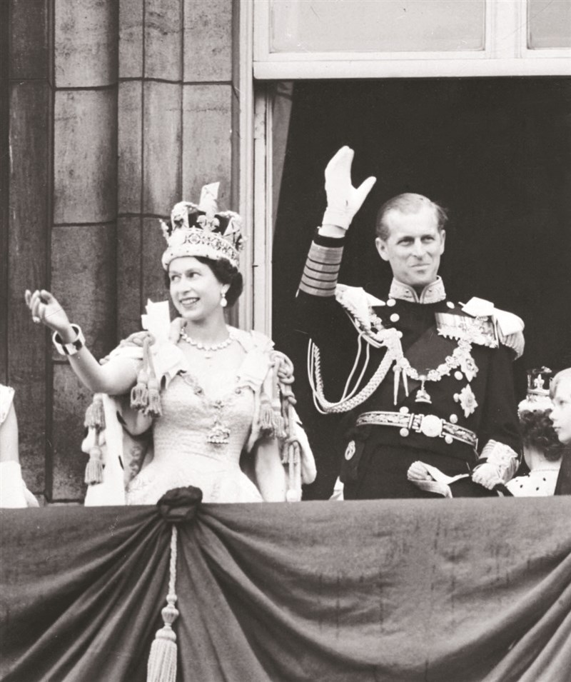 英國女王(左)1953年6月2日接受加冕,與丈夫菲立普親王向民眾揮手致意。圖/法新社