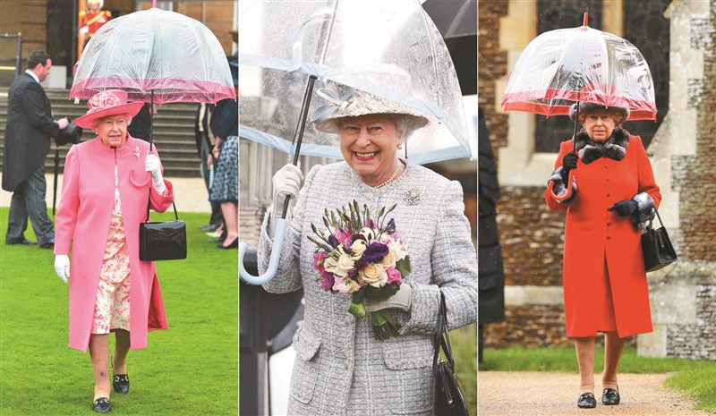 英國女王伊麗莎白二世的色票穿搭哲學,總讓民眾留下深刻印象,其實她的每個優雅造型的背後都別有用心。圖為她在二○一六年撐著傘,參加在倫敦白金漢宮舉行的花園派對。圖/美聯社