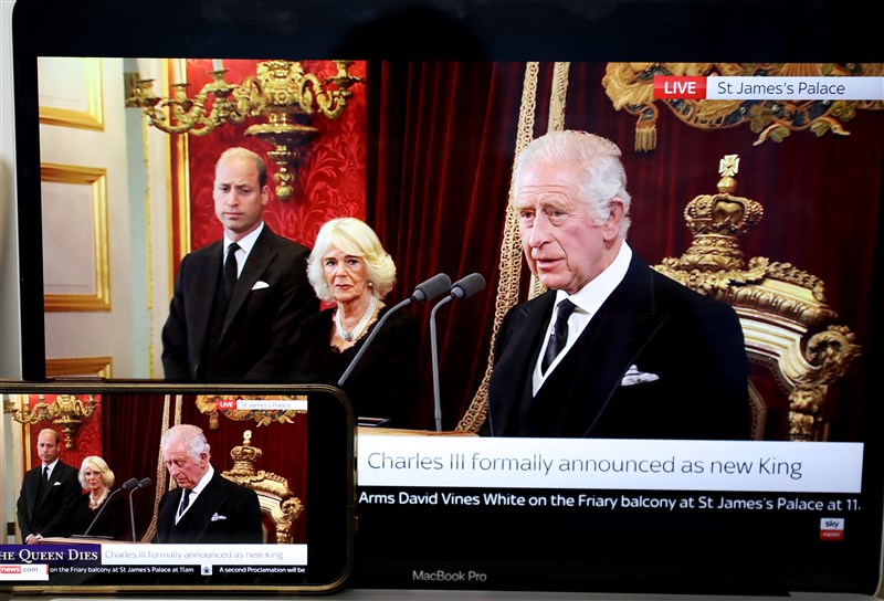 查理三世正式成為英國君主發表講話的直播畫面。圖/新華社