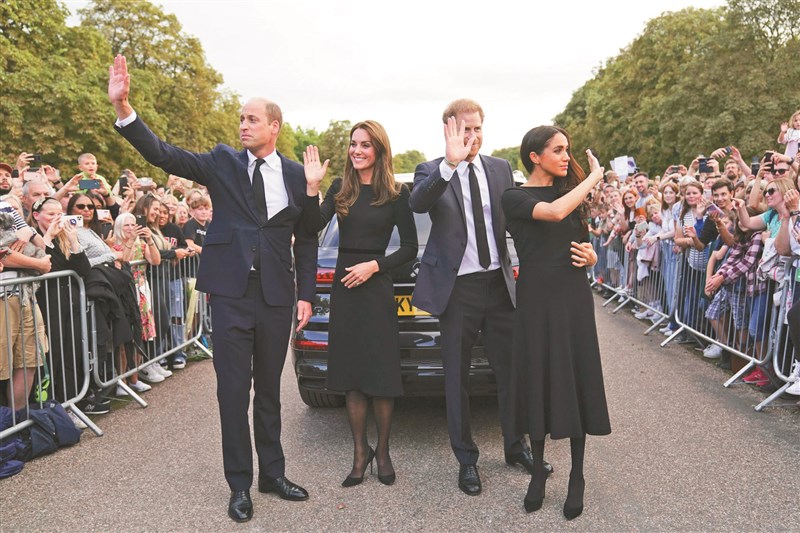 【本報綜合外電報導】近年來關係不睦的英國威廉王儲夫婦和哈利王子夫婦,十日在溫莎堡門外共同現身四十分鐘,漫步觀看民眾為祖母伊麗莎白二世獻上的鮮花祭品。這是自二○二○年三月九日大英國協日以來,兩對夫婦首度在公共場合一起亮相。英媒報導,在查理三世要求兄弟倆於女王葬禮前「擱置彼此不和」後,威廉王子於「最後一刻伸出橄欖枝」,打電話邀請哈利夫婦同行。