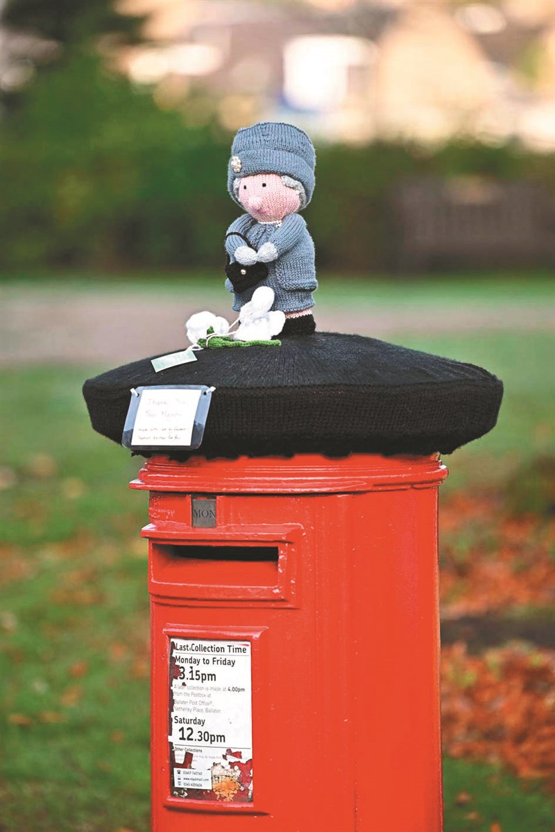 在蘇格蘭巴勒特村一處郵箱上,擺放著伊麗莎白二世造型的編織娃娃。圖/法新社