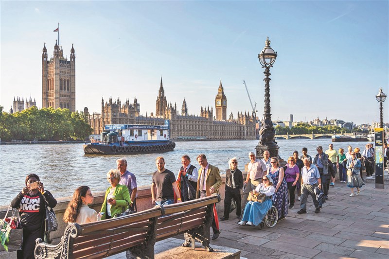 英國民眾十四日在倫敦西敏廳外排隊準備瞻仰女王伊麗莎白二世靈柩。