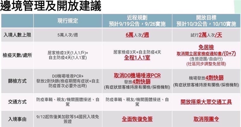 有網友在PTT的八卦板上已「邊境10月開放」為題PO文,強調這張表格來源不明,但很多人都透過不同管道取得了,內容包括邊境開放分2階段,第一階段為9月19日公布、9月26日實施的「3+4全程1人1室」,第二階段為10月3日公告、10月10日實施的「0+7免居隔」方案。與昨日莊人祥在記者會上表示,疫情達高峰明顯下降後才會實施,10月份有機會,但月初就開放的可能性比較低,不謀而合。