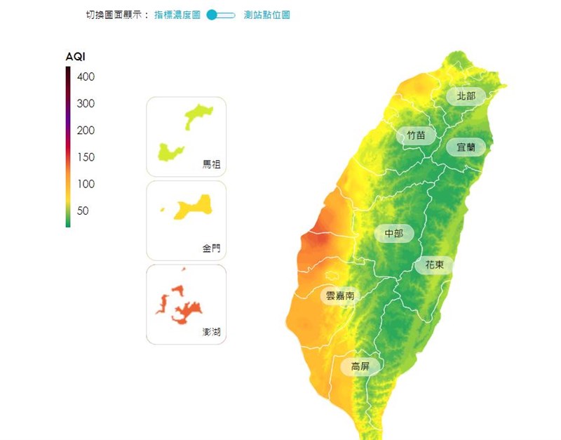 而根據監測,雲林地區崙背、麥寮、台西等地,空氣品質指標AQI高達134、126、113,已達紅害等級,對所有族群都不健康。