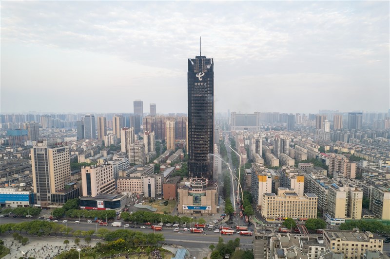 長沙的中國電信大廈發生火災,明火已撲滅。圖╱中新社