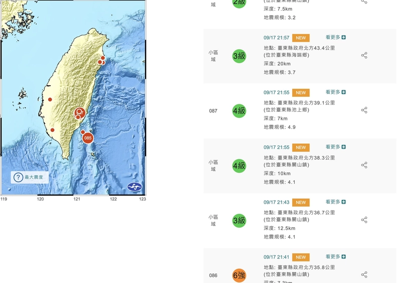 陳國昌提醒,芮氏規模6.4的主震之後還持續有餘震在發生,兩天內不排除會有規模5的餘震,五天內不排除規模4的餘震。目前餘震觀測到最大的一起,是在今晚22時45分,震央在池上鄉,地震深度8.8公里、芮氏規模達5.5,台東縣池上跟花蓮縣富里都有5強震度。