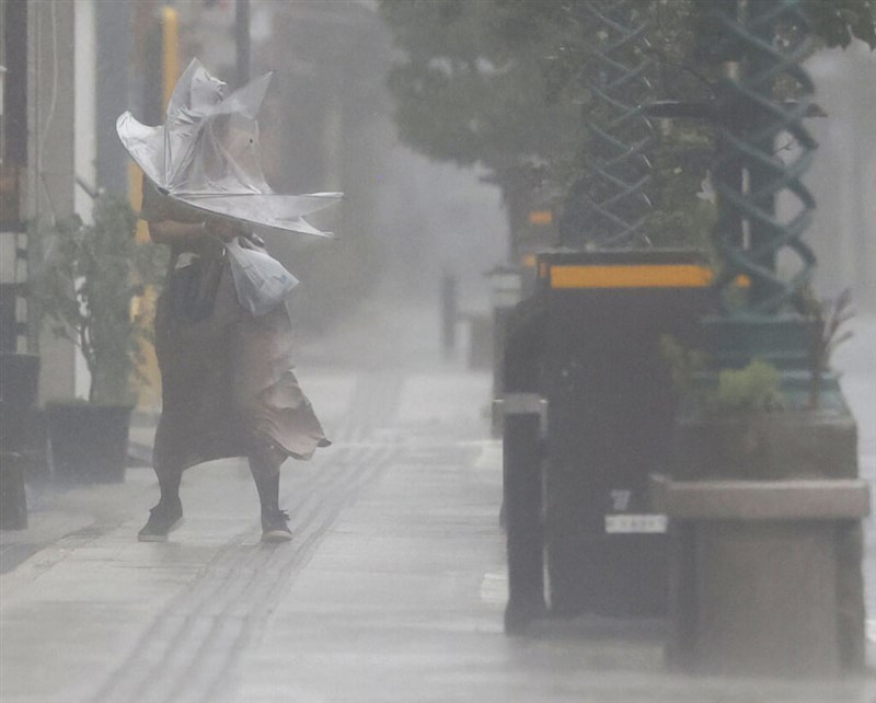 颱風南瑪都18日登陸九州地區,帶來狂風豪雨。圖為九州民眾18日撐傘抵禦風雨。圖/中央社