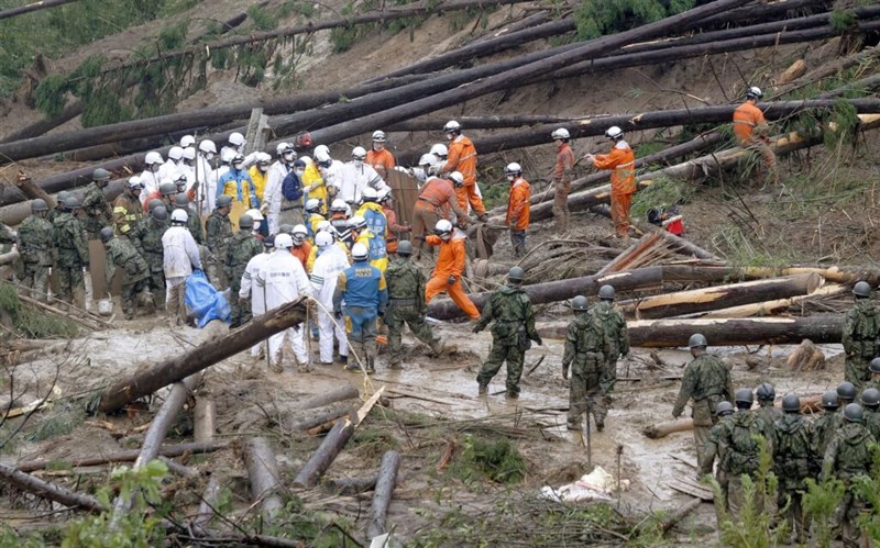 颱風南瑪都挾帶狂風豪雨,日本宮崎縣一棟房屋遭土石流掩埋,搜救隊員現場搶救。圖/中央社