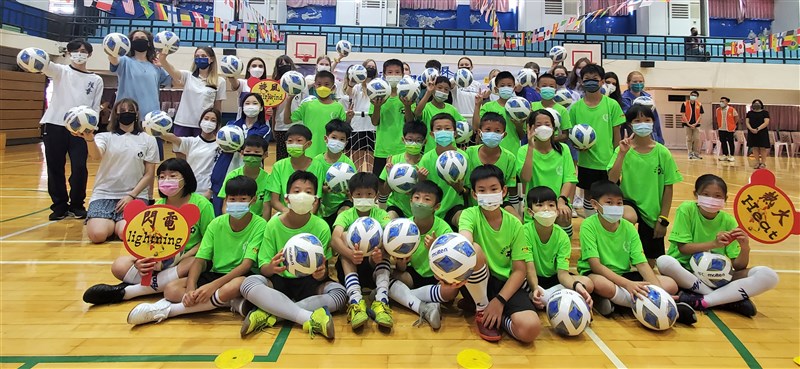22位國際交換生與22位蘆洲國小足球隊共同參與聯合國足球趣味競賽。圖/新北教育局提供