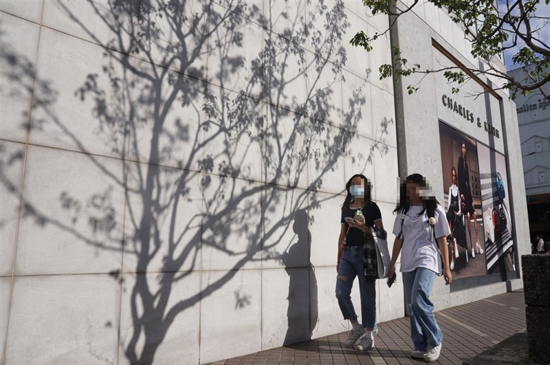民眾在市區散步時,暫時拉下口罩透氣。圖╱中央社