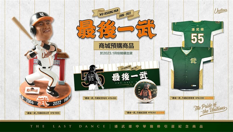 【記者張哲郢綜合報導】中華職棒統一獅老將潘武雄將於10月1日在主場引退,獅隊也為此推出一系列周邊,為滿足球迷,即日起獅隊開放最終預購,包括公仔、球衣、毛巾與紀念球,預購無限量接單。