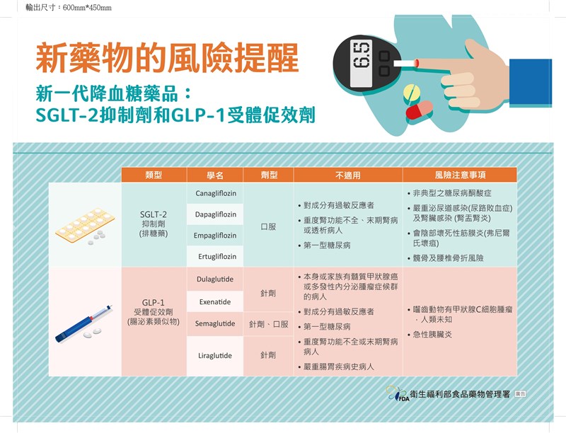 2款新一代糖尿病降血糖藥 恐引急性胰臟炎 |2022.09.21 語音朗讀 1224觀看次 字級 大 中 小 藥物示意圖。圖╱unsplash 【本報台北訊】國內超過220萬糖尿病患者,而糖尿病藥物發展快速,近年2款新型降血糖藥物「SGLT-2抑制劑」和「GLP-1受體促效劑」,除了不易出現低血糖副作用,還有心血管保護及減重效果。不過食藥署提醒,新一代降血糖藥物近年有接獲疑似藥物引起急性胰臟炎的個案,建議民眾服藥前應諮詢專業人員,並配合醫囑按時服藥。食藥署藥品組科長洪國登表示,我國糖尿病患者中以第二型糖尿病較多,且男性發生率較女性高。而有糖尿病患者,同時也可能有高血壓、高血脂、癌症等共病存在,近年糖尿病初次發病更有年輕化趨勢。食藥署指出,新一代降血糖藥品「鈉-葡萄糖協同轉運蛋白-2抑制劑(SGLT2 inhibitors)」和「類升糖素胜肽-1受體促效劑(GLP-1 receptor agonists)」,除不易出現低血糖的副作用,還額外提供心血管保護及減重的效果。雖副作用較低,但近年接獲疑似因GLP-1受體促效劑導致急性胰臟炎之藥害救濟申請案。食藥署提醒,新一代降血糖藥品仍有一定風險。圖/食藥署提供中華民國糖尿病衛教學會理事長王治元表示,患者使用GLP-1受體促效劑,可能伴隨腸胃道不適,像是噁心、嘔吐、腹瀉等副作用,若有家族性髓質甲狀腺癌、多發性內分泌腫瘤症候群的患者,因禁用GLP-1受體促效劑類之抗糖尿病藥物。且服藥期間,若有胰臟炎等症狀,應盡速就醫檢查。使用SGLT2抑制劑或GLP-1受體促效劑,雖然可以達到降低血糖及控制體重的效果,但SGLT2抑制劑可能會提高生殖器和泌尿道感染、骨折和酮酸中毒的風險。王治元提醒,若出現頭暈、噁心、嘔吐、腹痛及不尋常的疲倦、嗜睡或昏迷等症狀,應盡速就醫檢查。若使用SGLT2抑制劑後,出現呼吸急促、全身倦怠、痠痛等,也要告知臨床醫師,求證是否為藥物副作用。控制糖尿病要多管齊下,不只靠藥品,仍須配合規律飲食和運動、控制體重。王治元建議從睡眠、運動及飲食3面向改善生活型態,晚上9、10點即可就寢,每日要睡7到8小時,根據過去研究,中午稍作10到30分鐘午休,也是良好生活型態之一;根據研究,每天運動累計20到30分鐘,即可預防身體退化及慢性病。飲食習慣也是控制血糖重要因素。王治元說,現在營養控制與過往不同,不再用規範「吃幾碗飯」、「吃什麼菜」,而是依照個人愛吃、常吃的食物類型,從中抓取適合分量來控制血糖,達到健康生活型態。食藥署提醒用藥安全5重點。圖/食藥署提供 前一篇文章 文大王子奇就任校長 盼解決學宿餐食交通問題 下一篇文章 金門沖繩兩地旅遊互動 年底擬展開包機直航 熱門新聞 01動物的精采瞬間(上)2026.02.0802台北書展對話 佛光山安定動盪人心2026.02.0803斯里蘭卡獨立節 佛光人至駐菲大使館同賀2026.02.0704台北書展 佛光山拉近佛與讀者距離 看得懂用得著 佛教徒必讀經典重磅獻禮2026.02.0705健康瘦身, 遠離糖尿病!2026.02.0706後備軍人教召 改為14天2026.02.0707星雲大師全集⑳【佛教管理學③】弘法系列人事篇 人事管理法①2026.02.0708台北書展 佛光山拉近佛與讀者距離 文心雕佛問世 楊渡、許悔之、廖玉蕙遇見佛 2026.02.0709日月潭神祕黑洞2026.02.0810福山寺送暖 福田戶投鉢植福2026.02.07 訂閱電子報 台北市 天氣預報 台灣一週天氣預報 相關報導 福壽山農場 賞梅聞花香高雄果嶺公園 大眼睛添童趣美濃大峽谷 盜採砂石106人遭訴橙色花瀑布牆 春節應景爆開日月潭走春 3撇步避壅塞枋寮.慢活