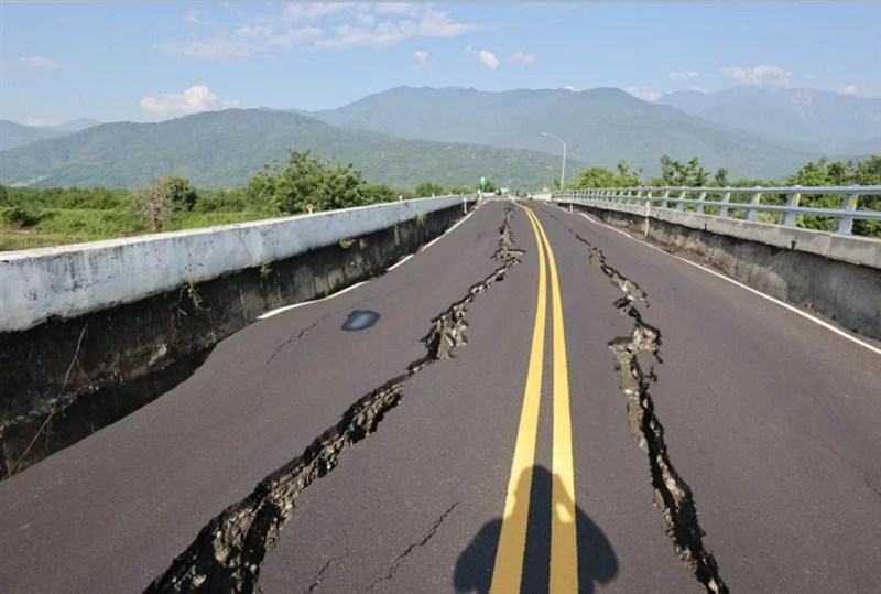 台東池上18日下午發生規模6.8地震,深度7.0公里,193縣道旁高寮大橋橋墩全斷橫躺在秀姑巒溪上,道路龜裂十分嚴重。圖/劉學聖