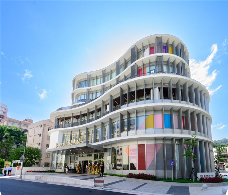 蔡萬才癌症大樓以微笑曲線的造型、搭配生態綠園,12種彩色玻璃為不同癌症的代表色,傳達「關懷」與「抗癌」的意象。圖/富邦集團提供