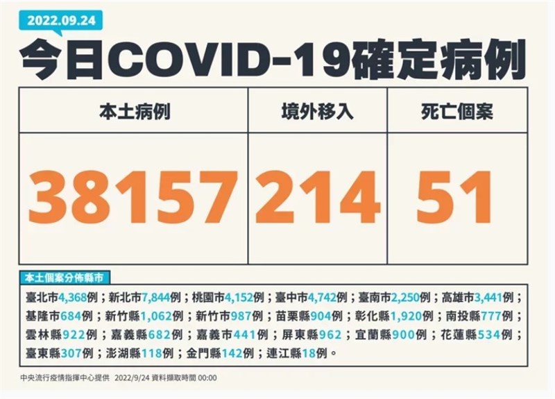 此外,中央流行疫情指揮中心今天公布國內新增38371例新冠病毒確定病例,分別為3萬8157例本土個案及214例境外移入;另確診個案中新增51例死亡。