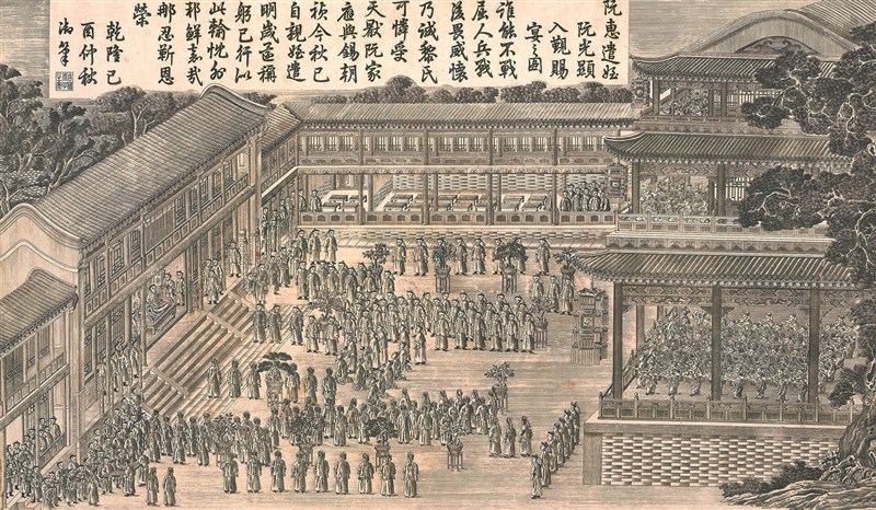 安南使阮光顯等人在清音閣看戲前,向乾隆皇帝行禮的情景,被宮廷畫師繪製成〈阮光顯入覲圖〉銅版畫。圖/取自故宮官網