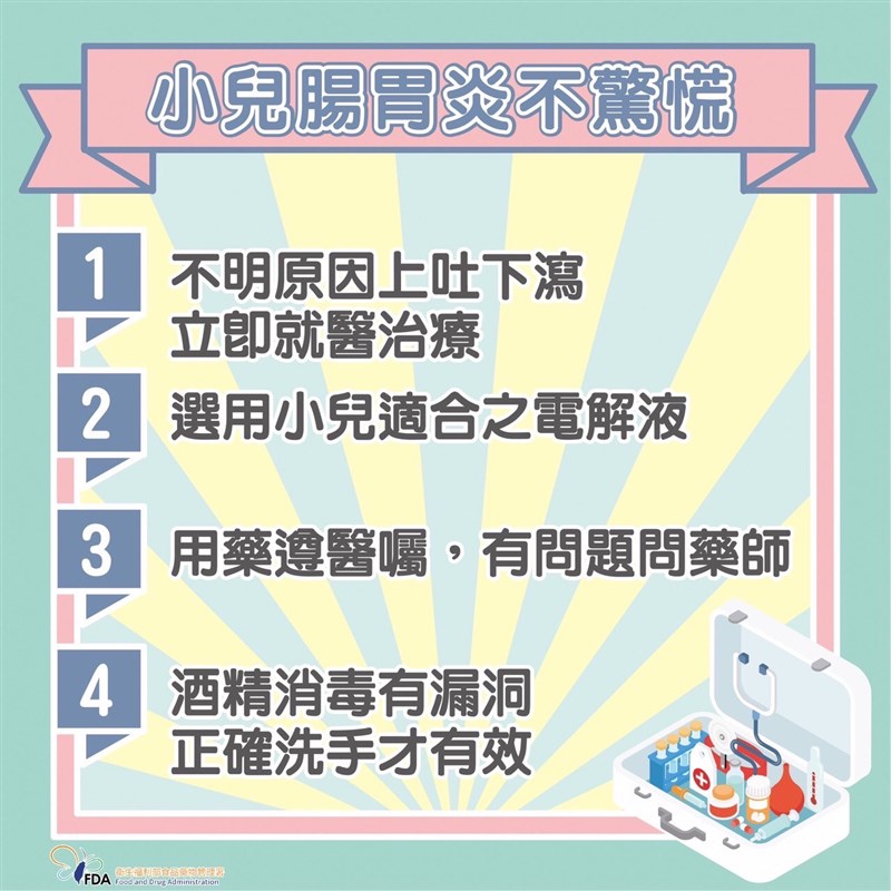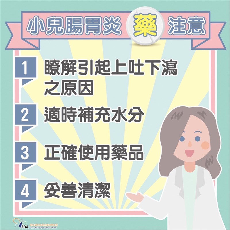 食藥署提醒,家中如有孩童出現上吐下瀉症狀,應先了解原因,並注意補充水分與電解質,醫師開立之藥品,應確實遵照醫囑及藥袋標示使用,如有不了解藥品使用方式,可諮詢藥師,以免導致藥物不良反應。圖/食藥署提供