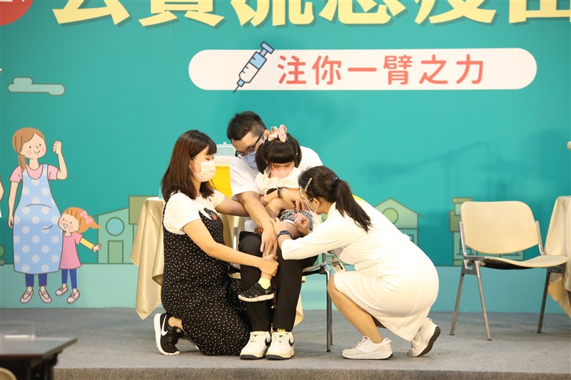 素人孕婦媽媽與其學齡前幼兒,於疾管署B1大禮堂,率先施打流感疫苗。圖/疾管署提供