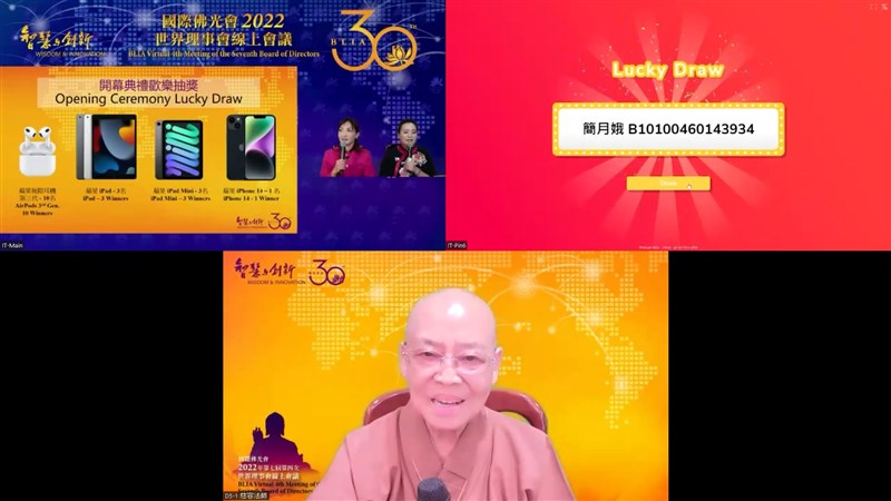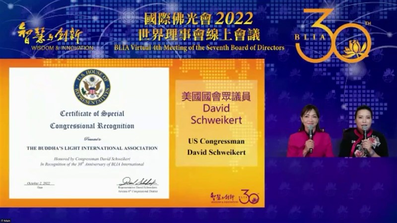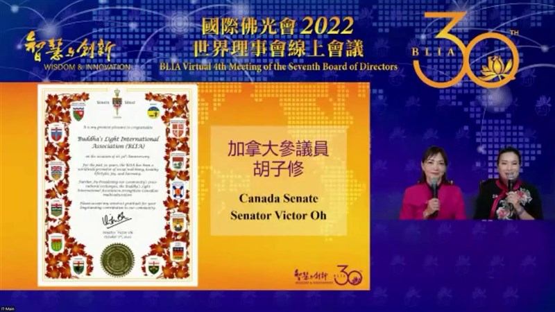 做別人沒想到的事 全球萬人同步宇宙會 |2022.10.02 語音朗讀 14109觀看次 字級 大 中 小 2022世界理事會線上會議大合照。圖╱國際佛光會舊金山協會提供 【人間社記者覺皇、李永苓美國舊金山報導】在全球佛光人企盼中,為期8天的「國際佛光會2022年第七屆第四次世界理事線上會議」開幕典禮,於美西時間10月1日下午6時、台灣時間2日早上9時舉行。首次透過高科技以「元宇宙會議」方式召開,讓世界總會總會長心保和尚、署理會長慈容法師與理事依空法師、心培和尚、慧傳法師、祕書長覺培法師、榮譽總會長吳伯雄及副總會長劉長樂、劉招明等分布五大洲不同時區一萬多位佛光人,藉由虛擬3D方式,共同見證國際佛光會成立30周年,在文化、教育、慈善、宗教等各方面活動的輝煌成果。會員們登入虛擬會議後,點擊山門動態前往成佛大道,再進入大雄寶殿主會場,參加開幕式。隨著司儀的介紹,來自非洲、歐洲、南亞、東南亞、馬來西亞、日本、總本山、全台灣各地、大洋洲、南美、北美、美東,以及在會議現場的洛杉磯協會代表們,揮著各地區的國旗相互問好,體驗這場呼應大會主題「智慧與創新」,特別舉辦的萬人元宇宙會議,以中文、粵語、英文、法文、日文、西文、葡文、德文等8種語言同步進行。國際佛光會世界總會成立的資料照片。圖╱國際佛光會舊金山協會提供●會議召開 善人聚會一處會中播放創會會長星雲大師開示與榮譽總會長吳伯雄、副總會長劉長樂及貴賓致詞。大師將會議召開類比西方極樂世界、靈山勝會與佛光會大會的諸上善人聚會一處的狀況。大師表示「由於開會,讓佛教流傳;由於開會,讓所有的臨濟兒孫滿天下;由於開會,讓佛光人今天又團結,相聚結緣,真是於千萬佛所種諸善根,才有現在的聚會。我們佛光會在1992年成立,從台灣到美國、從美國及世界各地,為佛光會寫了一個新的歷史,希望50年後,世界各地的佛光弟子,還能夠有這樣的聚會。」大師並祝福大家,把歡喜、佛祖給予的平安吉祥帶回去,永遠享受。美國國會聯邦眾議員US Congressman David Schweikert致贈賀函。圖╱國際佛光會舊金山協會提供榮譽總會長吳伯雄致詞,佛光會的宗旨主要是透過在家眾的力量來護持佛光山的弘法,就像車之雙輪,同時齊頭並進,大師提倡的三好運動已經變成整個社會普遍能夠接受的目標。吳榮譽會長分享家族四代護持佛光山道場,期許每個人不但自己做一個佛光人,也要讓自己的家庭變成佛光家庭,讓佛光會的宗旨、目標有傳承,能夠一代一代的傳下去。國際佛光會世界總會榮譽總會長吳伯雄致詞。圖╱舊金山協會提供劉長樂副總會長致詞,指出30年前,大師發心結緣在美國創立了國際佛光會,這是華人世界和宗教界的一個標誌性的事件。佛光會以自身的善念、善語、善行,弘揚中華文化,散播佛陀的思想,幫助遭受戰爭、災禍病痛之苦的民眾,成為全球最有規模的佛教社團組織,「大師開創的國際佛光會為世界種下了傳播佛教的種子,佛光人承擔起承上啟下的責任與使命,佛光人如同陽光一樣在世界上點亮般若的火炬。」貴賓洛杉磯第一區縣政委員蘇麗絲讚揚「西來寺一直是南加州社區的支柱,對社區的福祉推廣所付出的努力與奉獻精神值得表揚,也成為當地的楷模,這就是其想要建立的社區榜樣;相信以信仰作為基礎的組織,對當地社區的提升扮演著不可或缺的角色。」加拿大參議員胡子修致贈賀函。圖╱國際佛光會舊金山協會提供●佛光精神 讓世界更好除了貴賓賀詞外,美國國會聯邦眾議員US Congressman David Schweikert、美國加利福尼亞州參議院 Bob J.Archuleta(鮑勃‧阿丘利塔)、美國亞利桑那州議員Arizona House of Representatives John Kavanagh、加拿大參議員Victor Oh(胡子修)與加拿大國會議員Rechie Valdez等都頒發賀狀。總會長心保和尚致詞感謝大家的發心、付出,因為大家的努力才有佛光會30周年這樣的里程碑,不論是成績、功德,都是屬於每一個佛光人。1992年,世界總會在洛杉磯創立,30年後,又回到洛杉磯,意義殊勝。我們佛光會本持著人間佛教的理念,要讓世界愈來愈好,雖然時空不一樣,但是每位佛光人都是具有佛光的精神,如同佛光人心中都在發光,讓我們的世界看到光明、看到希望,如同大師講的愈來愈歡喜,並指出「因為大家的付出全世界很多的議員、市長,他們都發函來祝福我們佛光會30周年,這是大家的光榮;感謝北美洲各協會及道場的努力。」國際佛光會世界總會總會長心保和尚致詞。圖╱國際佛光會舊金山協會提供●微電影創作頒獎2022年三好微電影國際創作競賽也在此次殊勝會議中頒獎,來自巴西、台灣、南非等地的參賽被提名人與團隊都親臨會場,前3名接受頒發獎盃與獎金。第一名有兩位得獎者,現場分享感言。獲得紀錄片第一名的導演Si fiso Mlungisi Kh an yile(sai fa Mnlung S)來自非洲,他感謝佛光會給於這個機會完成這部作品。影片是關於約翰尼斯市廢鐵回收者covid期間遭遇的困境,這些回收者很少會被注意到,而且有很多無處可去。也因為他們有很多的限制,所以希望透過這部片能夠為他們發聲,感謝大會的肯定。綠色公益片第一名的導演Pâmela Peregrino,來自巴西,她表示:感謝大會對這部電影的肯定,可以讓大家知道當地傳統原住民生活受到外界的破壞。2022年三好微電影頒獎典禮,國際佛光會世界總會總會長心保和尚頒獎給第一名得獎者。圖╱國際