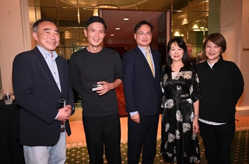 旅美小提琴家林昭亮(左1)、雲門舞集總監鄭宗龍(左2)、駐休士頓辦事處處長羅復文伉儷(右3、右2)及雲門執行總監洪家琪(右1)合影。圖/駐休士頓台灣書院提供