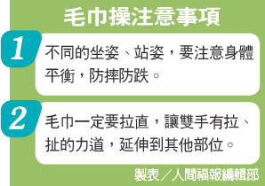 一條毛巾 就能增肌、防衰老 |2022.10.04 語音朗讀 4646觀看次 字級 大 中 小 毛巾操可以改善腰痠背痛。圖/資料照片 【本報台北訊】想運動但抽不出時間,或沒機會上健身房怎麼辦?其實,一條毛巾就能改善腰痠背痛、增肌、防衰老,是最簡單有效的懶人養生法。「經營之神」王永慶堪稱毛巾操的代名詞,每天都會規律做毛巾操,因此相當長壽。毛巾操最大的好處,就是不受時間、空間限制,站著或坐著、隨時隨地都可以進行,適合各年齡層。運動教練葛厚函說,做毛巾操相當簡易,這項運動的原理,是雙手握住毛巾兩端,慢慢帶動脊椎的伸展活絡神經,過程中隨時調整身體平衡,能促進各部位施力、消耗熱量。葛厚函指出,可採站姿或坐姿做毛巾操,先準備好一條毛巾、二個水瓶或一張椅子,推薦可做三組毛巾操動作,以及水瓶上肢訓練。一天做一次毛巾操,或是讓手臂上舉、旋轉與伸展,配合呼吸調節,不僅可以伸展四肢、強化肩部旋轉肌群,舒緩肌肉痠痛問題,也能改善骨質疏鬆、五十肩等問題。圖/資料照片毛巾操三動作動作一1、站姿時,打開雙腳與肩同寬,坐姿則是坐椅子的一半,保持挺胸、收下巴。2、手握毛巾兩端且保持緊繃的狀態,兩手張開的寬度要大於肩膀。3、吸氣時,雙手向上擴胸;吐氣時,雙手慢慢收回到肚臍的位置。4、反覆三次,感受到身體漸漸熱起來。動作二1、加強難度,身體彎曲、毛巾從胸口往前推到最前面。2、再往右側旋轉,繞到頭頂上方後,雙手回到胸口位置。3、右側方向做三次後,再換左側做三次。動作三1、雙手拉高、往左側轉,雙手拉到後腦勺,保持擴胸鍛鍊背部肌肉。2、停頓幾秒後,身體回正。3、反覆做三次後,再換右邊做三次。製表/人間福報編輯部水瓶上肢訓練也可以利用水瓶加強上肢訓練。葛厚函說,水瓶訓練動作可以幫助肩關節的活動度,上肢變得比較有力量。動作:1、椅子坐一半、肩膀下壓,不要聳肩,雙手握住水瓶張開在身體兩側,慢慢抬到與肩膀平行的位置。2、一手撐住,另一隻手慢速往下,左右交換各做二十下,有效活動雙肩的三角肌。3、最後雙臂甩手放鬆,或兩手交互按摩上臂,做收操的動作。如果有五十肩問題,雙手可握住水瓶往兩側張開,在肩膀的高度用小臂旋轉,一樣有活動肩關節的效果。 前一篇文章 瓜子素基湯 香脆營養好滋味 下一篇文章 心臟病族群增加 累、喘、腫勿輕忽 熱門新聞 01佛光山365日越文版 贈西貢日航大酒店2026.03.2702紅綠葡萄抗氧化抗發炎 連皮吃獲取健康全效益2026.03.2703台灣工藝3專書 呈現文化獨特樣貌2026.03.2704中職37年 明大巨蛋開幕戰2026.03.2705博鰲論壇 黃循財:支持陸加入CPTPP2026.03.2706南華創校30年 百年樹人邁向永續2026.03.2707照明工具 原理與演進2026.03.2708西半部冬季降雨75年新低 新竹水情亮黃燈2026.03.2709把握遠視儲備期 防兒童近視惡化2026.03.2710人間佛教聯合總會訪三燭寺 互勉弘法利生2026.03.27 訂閱電子報 台北市 天氣預報 台灣一週天氣預報 相關報導 高糖飲食阻兒童發育 深層睡眠增生長激素馬鈴薯、菠菜、豆類 補鉀好來源把握遠視儲備期 防兒童近視惡化紅綠葡萄抗氧化抗發炎 連皮吃獲取健康全效益元智師生跨界共創 唐寶寶畫作特展防記憶力衰退活化大腦 吃核桃黑芝麻養腦補腎