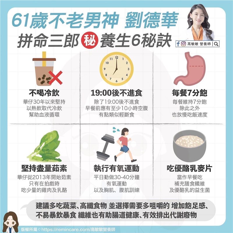 阿湯哥與劉德華 60不老養生祕訣 陳玲芳 |2022.10.04 語音朗讀 11309觀看次 字級 大 中 小 「阿湯哥」湯姆克魯斯近作《捍衛戰士:獨行俠》,帶給觀眾無限感動。圖/UIP 【記者陳玲芳專題報導】如果請大眾票選東西方演藝圈的「不老傳奇」,人稱「阿湯哥」的湯姆克魯斯,與「華仔」劉德華,絕對是圈內「數一數二」的影視天王。同樣年逾六旬,兩大天王究竟有何不老養生祕訣?且聽營養師怎麼說。60歲的湯姆克魯斯,一直堅持親自演出動作場面,即使步入中年,依然身強體壯、魅力無窮;營養師高敏敏說,阿湯哥超級「忌口」,且能在生活中展現極高度「自制力」。她歸納出其「逆齡」生活8大祕訣:圖/高敏敏提供1.減少精緻澱粉:當蛋白質與糖分結合時,會導致「糖化作用」,這對彈力蛋白和膠原蛋白會造成許多負面影響,同時也降低了肌膚的彈性與柔軟度;另外,過多的澱粉,會導致胰島素分泌不穩,不利於血糖控制,人也會因此提早老化。高敏敏建議,如果想吃澱粉,就以未精緻澱粉為主,如大麥、南瓜、地瓜、玉米、馬鈴薯等。2.不吃高溫油炸物:高溫烹調的食物,容易讓養分流失,提高體內發炎風險;建議平時以蒸烤或低溫烹調,可多吃菠菜和橄欖油等。3.多吃原型食物:蛋白質選擇白肉、乳清蛋白等,其他則以燕麥、蔬菜、堅果為主。4.控制每日熱量:控制每日熱量攝取外,也以「原型食物」為主要選擇,並力行「少量多餐」。5.嚴格執行有氧重訓:維持訓練量,避免運動倦怠與停滯期,以延緩老化。6. 少量多餐:阿湯哥曾經一天進食次數高達15次,正餐以外食物,以堅果、冷凍有機藍莓等為主。7.不碰甜食:阿湯哥會買蛋糕給團隊吃,自己卻「一口也不碰」,因為糖分攝取過高,除了肥胖之外,也容易導致發炎體質。但凡人如我,實在很想吃甜食怎麼辦?高敏敏建議,每日精製糖攝取量不超過整天總熱量的10%,最好降到5%。她以每日攝取2000kcal為例,添加糖攝取應低於200kcal(如能低至100kcal更好),大約是25至50g糖量,亦即控制在「半糖」的概念。8. 持續各種運動:平時可多元從事各種運動,包括爬山、划船、游泳等,融合有氧與重訓,以期維持體能的彈性與平衡。營養師高敏敏表示,61歲的劉德華也不遑多讓,令人驚嘆的凍齡外貌,為他贏得「不老男神」封號。劉德華(華仔)是演藝圈出了名的注重養生,之前公開自己晚餐,整盤大多是蔬菜;她特別整理歸納出「華仔」的茹素養生6祕訣:圖/高敏敏提供1.不喝冷飲:30年來,堅持以熱飲取代冷飲,因為「熱飲」能幫助血液循環。2.晚上7點後不進食:至隔天早餐前,應有至少10小時空腹,讓食物完全消化完畢,減少腸胃負擔;類似「輕斷食」,讓空腹時間拉長,更有利脂肪燃燒。3.每餐7分飽:維持每餐7分飽,遵守「不把胃撐大、不暴飲暴食」原則,並放慢吃飯速度,在固定時間內吃完晚餐。4.堅持盡量茹素:華仔從2013年開始茹素,只有在拍戲時,才會吃少量的雞肉及乳酪。5.執行有氧運動:平日勤做30至40分鐘有氧運動,以及胸肌、腹肌訓練,維持體能的彈性與平衡;也避免運動倦怠與停滯期,延緩老化。6.吃優酪乳麥片:將優酪乳麥片當做早餐享用,補充膳食纖維之外,也能攝取優酪乳的益生菌。長年以來都靠「茹素」養生的「不老男神」劉德華。圖/華仔天地 前一篇文章 睡眠呼吸中止症 牙科新解方 下一篇文章 苦等救命藥 罕病患者尋活路 熱門新聞 01佛光山365日越文版 贈西貢日航大酒店2026.03.2702紅綠葡萄抗氧化抗發炎 連皮吃獲取健康全效益2026.03.2703台灣工藝3專書 呈現文化獨特樣貌2026.03.2704中職37年 明大巨蛋開幕戰2026.03.2705博鰲論壇 黃循財:支持陸加入CPTPP2026.03.2706南華創校30年 百年樹人邁向永續2026.03.2707照明工具 原理與演進2026.03.2708西半部冬季降雨75年新低 新竹水情亮黃燈2026.03.2709把握遠視儲備期 防兒童近視惡化2026.03.2710人間佛教聯合總會訪三燭寺 互勉弘法利生2026.03.27 訂閱電子報 台北市 天氣預報 台灣一週天氣預報 相關報導 認識青春痘成因 正確抗痘避免留疤睡足多運動常吃蔬菜 改善生活習慣促健康高糖飲食阻兒童發育 深層睡眠增生長激素馬鈴薯、菠菜、豆類 補鉀好來源把握遠視儲備期 防兒童近視惡化紅綠葡萄抗氧化抗發炎 連皮吃獲取健康全效益 作者其他文章6神穴舒筋止痛 中醫養生兼抗老助眠把握遠視儲備期 防兒童近視惡化齒列矯正冒黑縫 黑三角真相跨國醫療 男童重拾笑容開心跑跳春分養生重調肝養血 拉筋伸展促氣血循環創世基金會 守護植物人40年