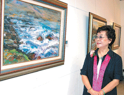 她說,展出的畫作中,有一幅是兩個多月前,在台北縣濱海公路鼻頭海邊畫的,當時正下著大雨,她只靠小貨車的遮雨板擋住作品,全身則被雨淋濕,令她印象深刻。