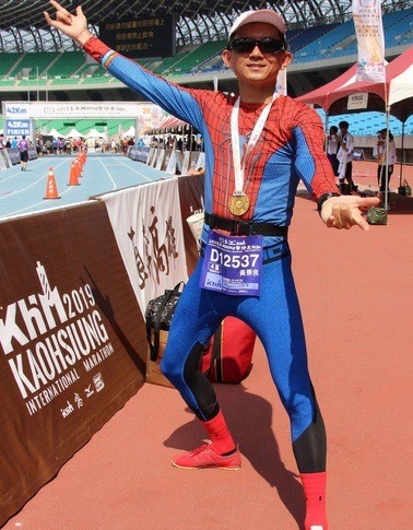 【記者王淑芬高雄報導】忙碌的校務工作讓校長黃景良的健康亮紅燈,12年前決心用跑步找回健康,從住家附近開始練跑,還挑戰馬拉松、三鐵等累積超過百場,遠渡美國 、日本等與外籍選手一較高下,尤其他一身「蜘蛛人」戰服,所到之處都是焦點。