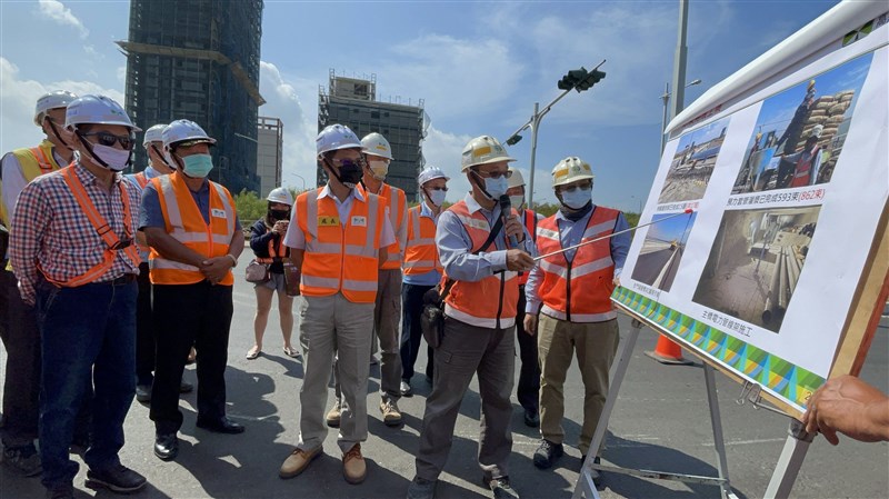 金門縣議會議長洪允典(前左)9月30日率議員赴金門大橋施工現場會勘。圖/中央社