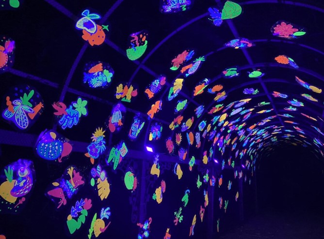而受邀於荷蘭阿姆斯特丹燈節的台灣團隊「有用主張」,也為知本溫泉區場域量身打造「金勵湯」。以泉水為靈感,將片片飛染的金光點綴在叢葉林間,延著月光灑落草地照亮霧氣,希望提供「精力湯」般的正能量,創造充滿暖意的光境。