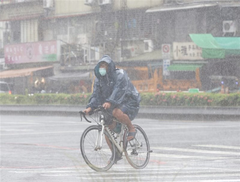 受東北季風影響,宜蘭及基隆北海岸等地區降下豪雨,中央氣象局表示,降雨要到9日後才會趨緩。圖為台北市信義區民眾穿雨衣騎乘腳踏車。圖/中央社