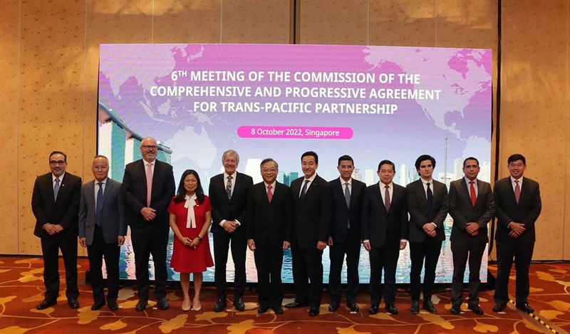 跨太平洋夥伴全面進步協定(CPTPP)第6次執委會8日在新加坡登場,各會員國代表在閉門會議之前合照。 圖/中央社