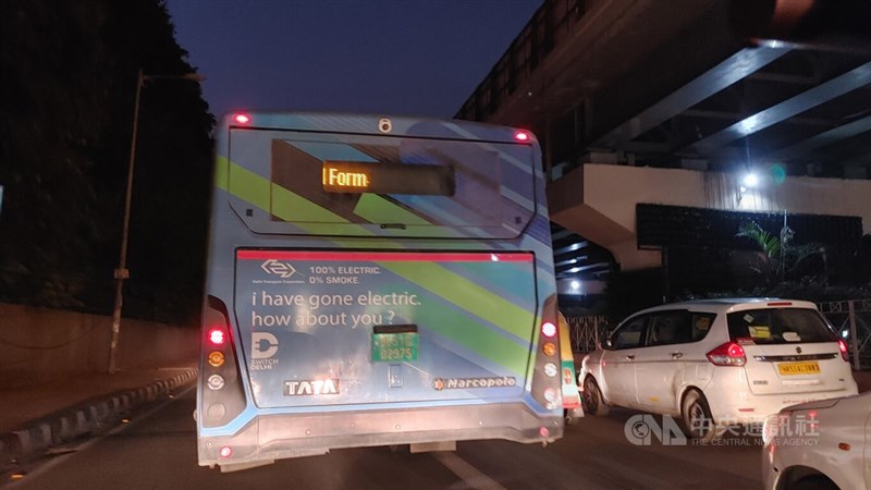 印度正加快發展電動車,就電動公車而言,各大城市的街道上目前已有3000多輛,預計未來兩年內還將增加3000多輛。圖為德里市區一輛電動巴士。圖/中央社