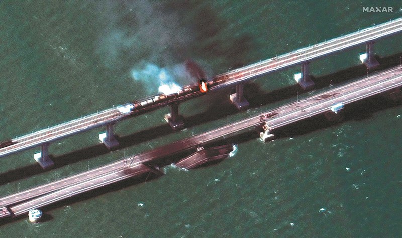 連接俄羅斯與其併吞領土克里米亞的克里米亞大橋8日發生爆炸,隔日俄羅斯砲擊烏克蘭邊境城市還擊。圖/法新社