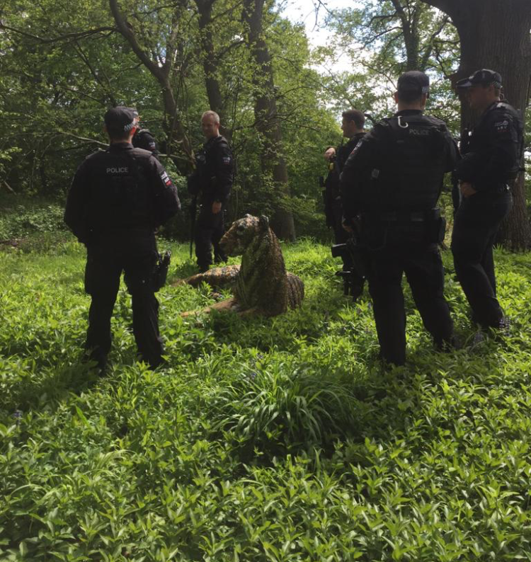 等到武裝警察們靠近後才發現,這裡果然真有一隻老虎沒錯,但這隻「老虎」根本不是動物,而是一尊栩栩如生的雕像。這尊老虎雕像是當地藝術家辛普森(Juliet Simpson)的作品,擺在這邊已經有超過20年之久,事後辛普森接受媒體訪問時表示,她當時接到電話說有一群警察跟一台直升機往家裡的方向衝來,嚇得她花容失色。