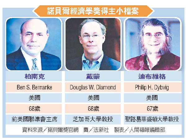 諾貝爾官方表示,美國聯邦準備理事會前主席柏南克、美國金融協會前主席戴蒙和耶魯大學前教授迪布維格3人,對「銀行和金融危機」的研究而獲獎,他們的研究結果對降低金融危機、經濟蕭條風險有貢獻,「1930年代的大蕭條導致全球經濟癱瘓多年,多虧今年獲獎者的研究見解,我們能更好應對未來可能發生的金融危機。」