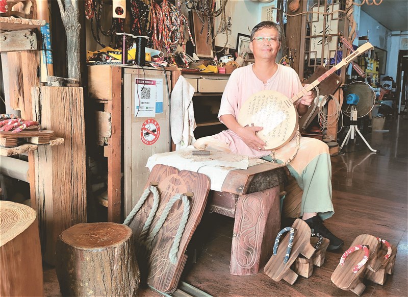 二十一年前他帶著妻兒返鄉定居,白天在飯店當房務員,晚上到夜市擺攤賣松木製木屐;他說,看到新北市九份老街的木屐店生意好、年輕人接受度也高,於是到九份習藝,稍加改良的客製化木屐大受歡迎,兼差收入遠勝正職。