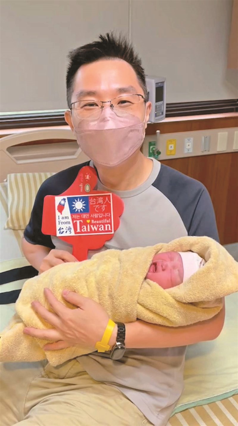 昨天國慶日,一名2735公克的女寶寶10時55分誕生於台北長庚,寶寶的爸爸開心拿著國旗手牌和寶寶合影留念。圖/台北長庚提供