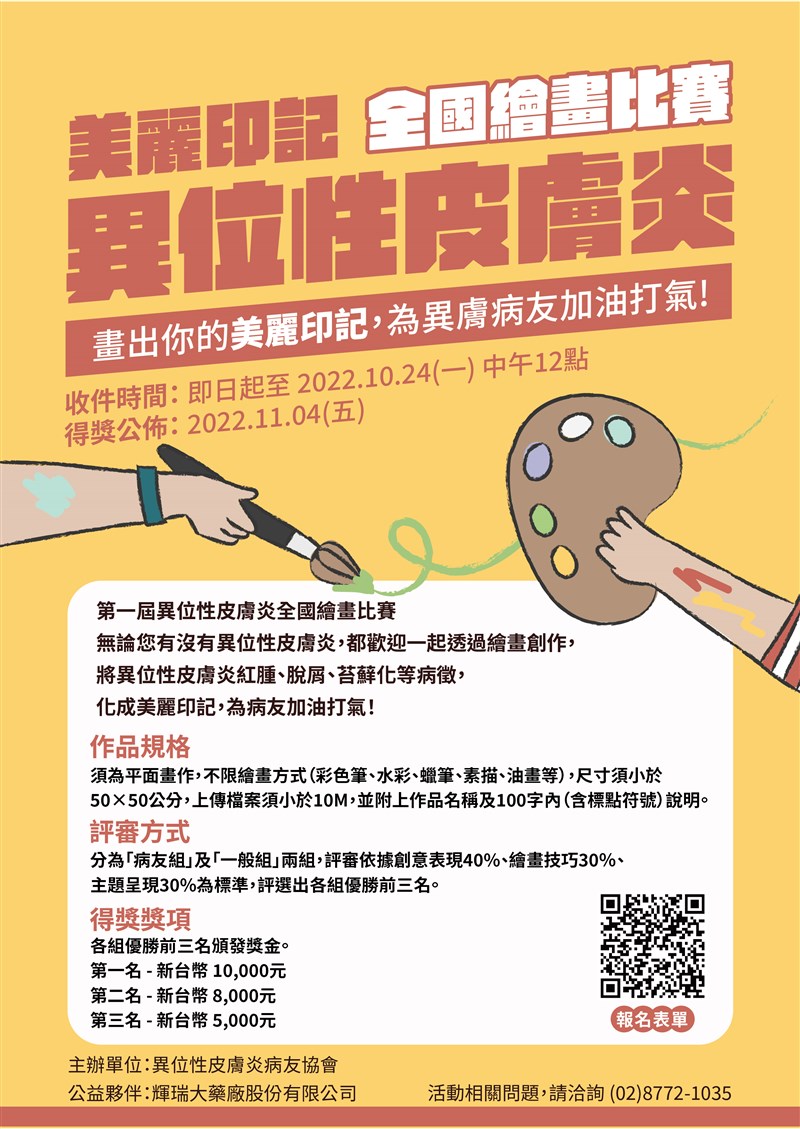 活動報名請透過線上表單:https://pse.is/4gvm8y,相關問題請洽詢(02)8772-1035。無論是否為異膚病友,都歡迎一起以繪畫擁抱彼此,傳遞溫暖正能量。